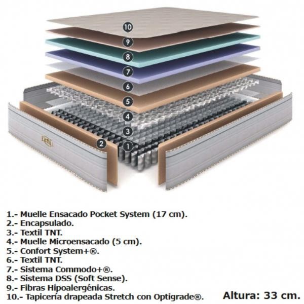 Máxima suavidad y transpirabilidad. Su núcleo de doble capa de muelles ensacados con forma de barril y embolsados individualmente funcionan como micro amortiguadores proporcionando un confort sublime. Cuenta con acolchado de fibras hipoalergénicas, el Sistema DSS y el Sistema Commodo+® que combinado con el Confort System+® logran maximizar la sensación de suavidad.
