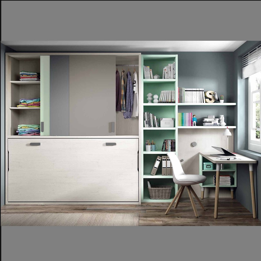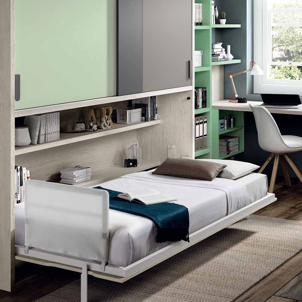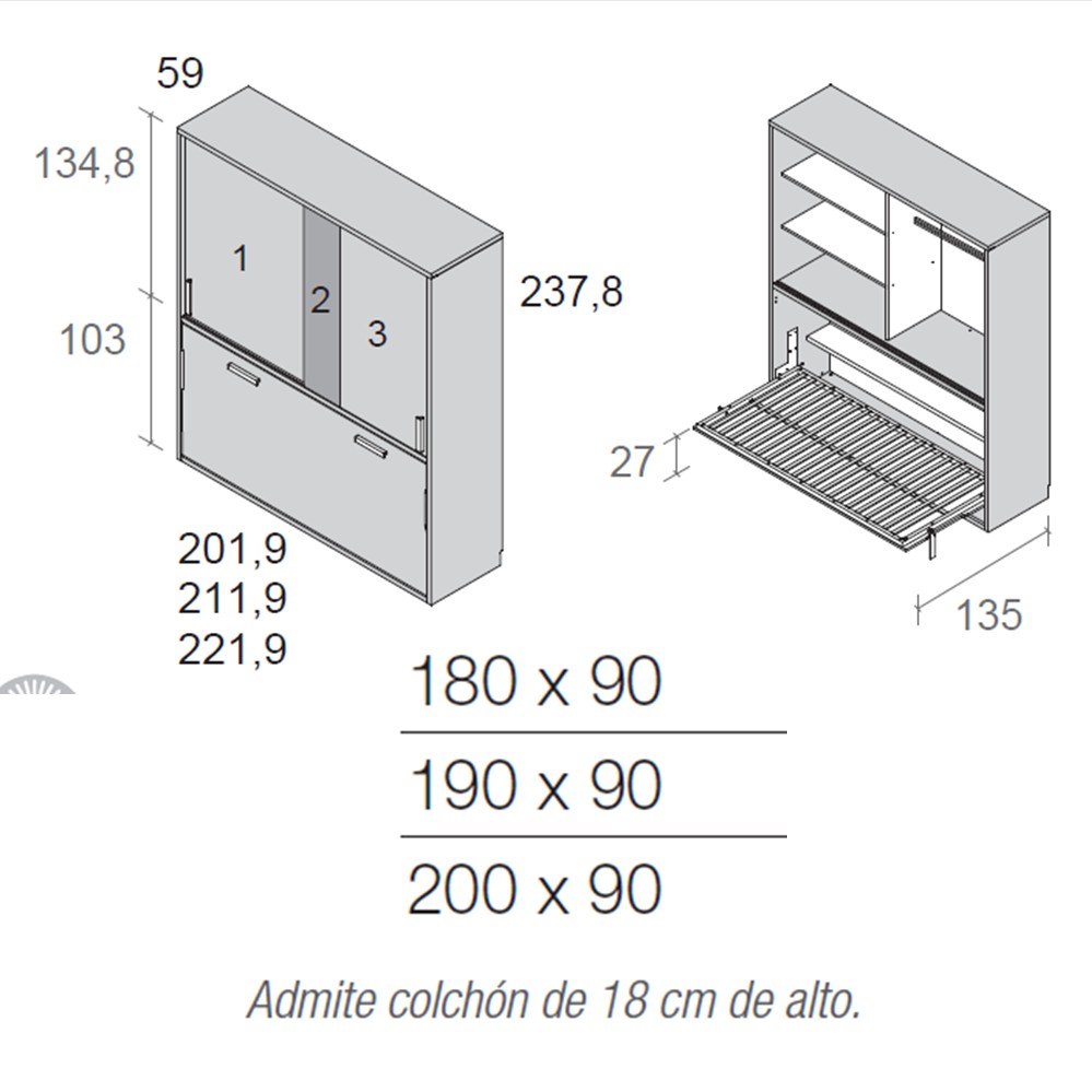 Una cama solida, con estructura metálica y somier de laminas que permite una perfecta transpiración y que de día podemos recogerla fácilmente por su buen sistema de apertura y cierre ocupando solo 60 cm de fondo dejando la habitación totalmente diáfana y con buen acceso a su parte superior.