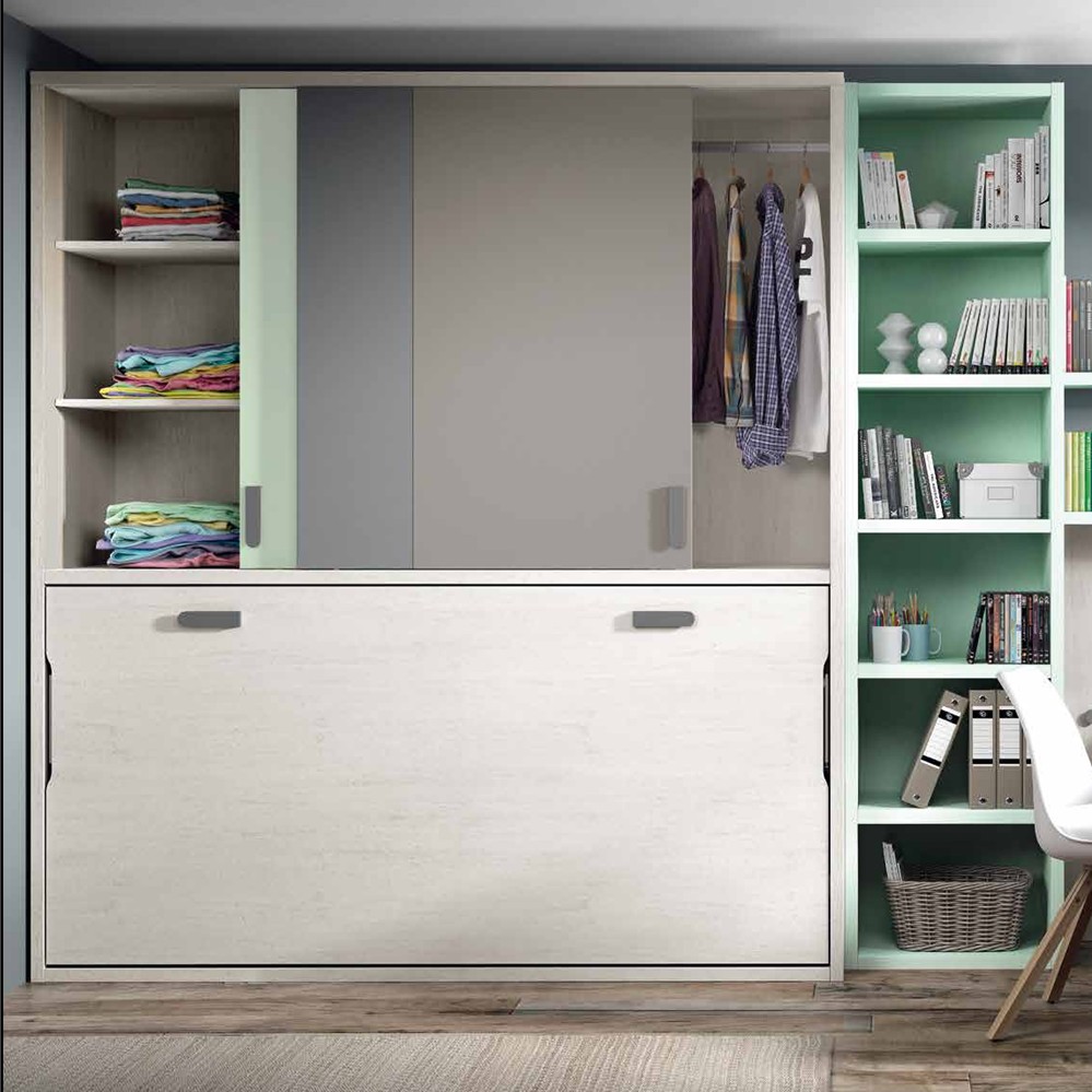 En la parte superior tenemos un práctico y amplio armario con puertas correderas, con una parte para ropa colgada y otra para ropa doblada, aunque podemos personalizarla. De forma que en un mínimo espacio tenemos una buena cama y un práctico armario.