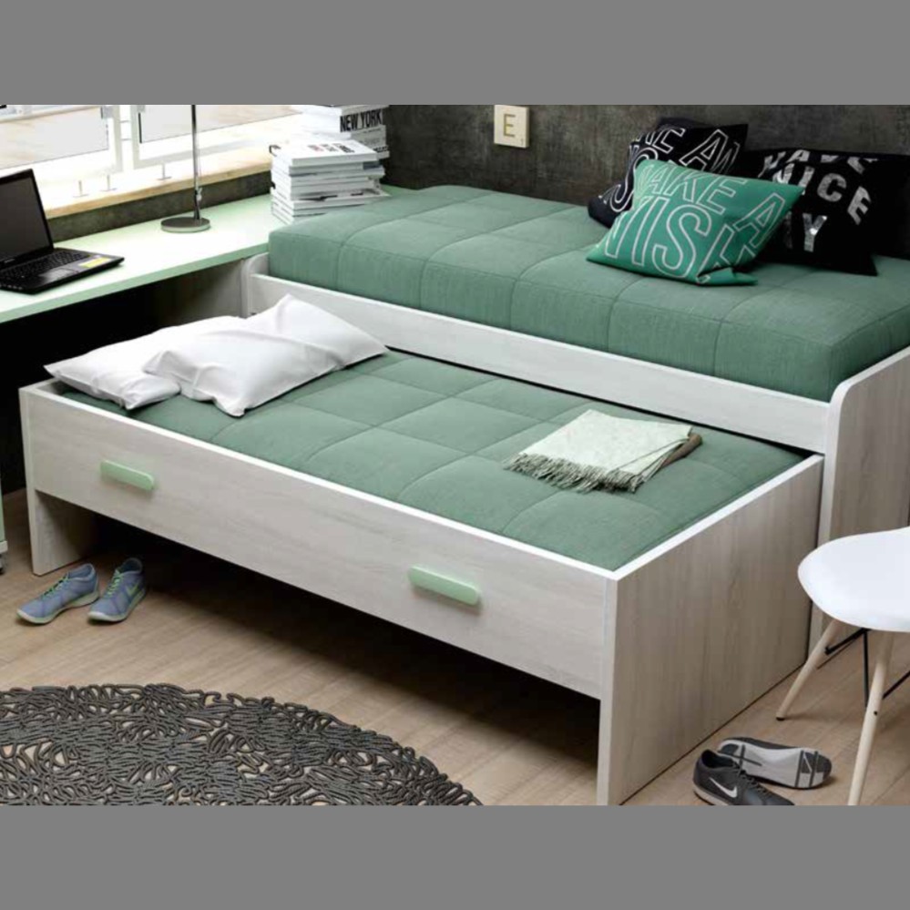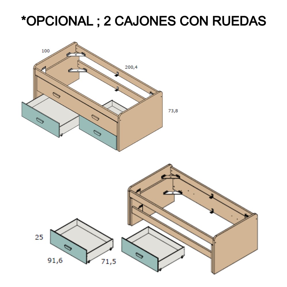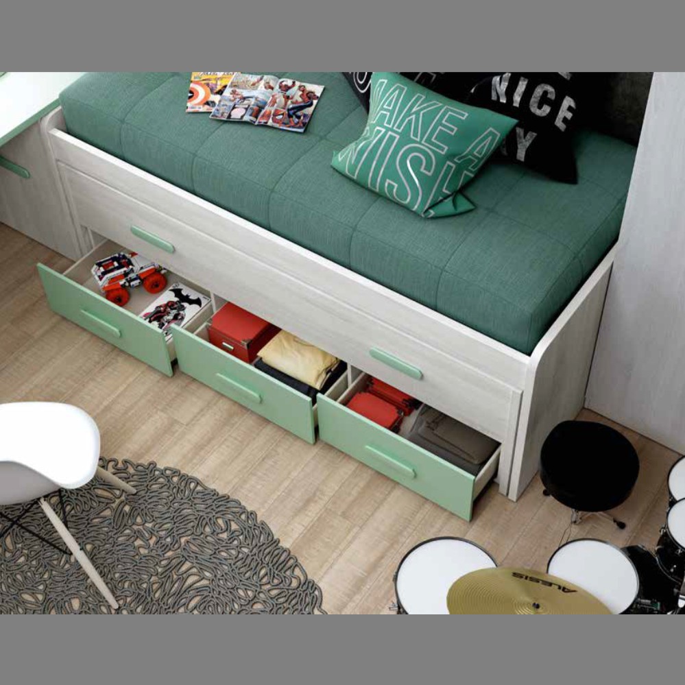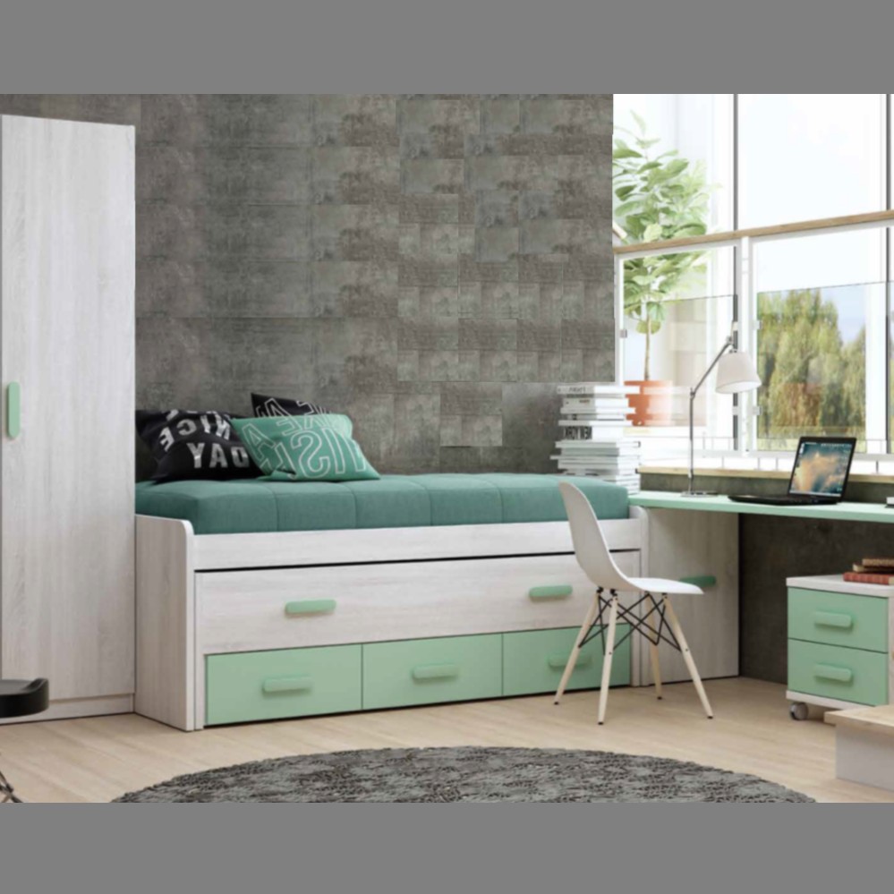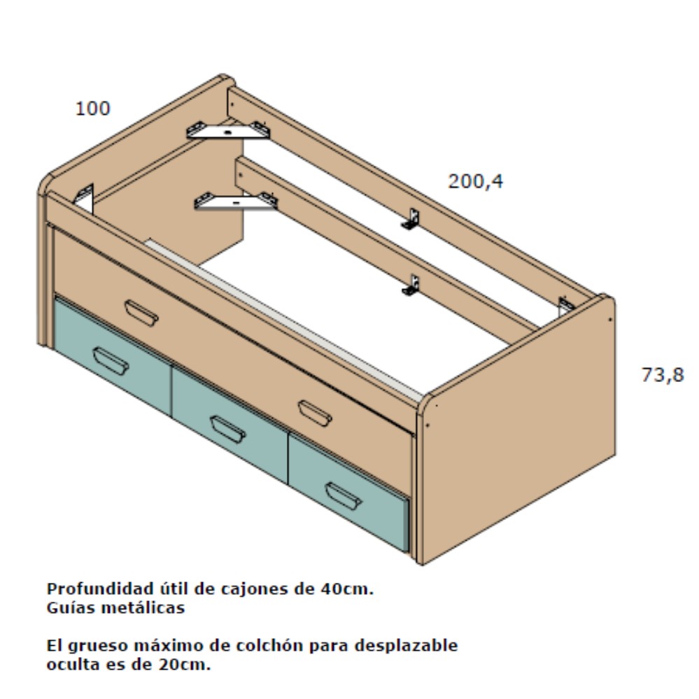En un espacio reducido, el hueco de una sola cama, disponemos de 2 camas más 3 prácticos cajones con guías metálicas correderas para su fácil uso. Esta cama además de ser fuerte tiene diferentes opciones según tus gustos y necesidades. Va acabada con tableros de 30 tanto en estructura como en largueros, lo que le da una gran fortaleza. La segunda cama puede ir abierta o cubierta, como en la foto, es de fácil apertura para su uso diario y llevan escuadras de seguridad más escuadras intermedias para una perfecta y solida acogida del somier. Los cajones inferiores pueden ir a suelo con ruedas, pero en esta versión van totalmente cubiertos, y con guías de aluminio que hacen que tanto su apertura como su cierre sean siempre perfectos evitando roces o golpes entre ellos. Los cantos de cabecero y piecero de la cama superior van redondeados, sin aristas, con una estética suave y acabados en PVC.