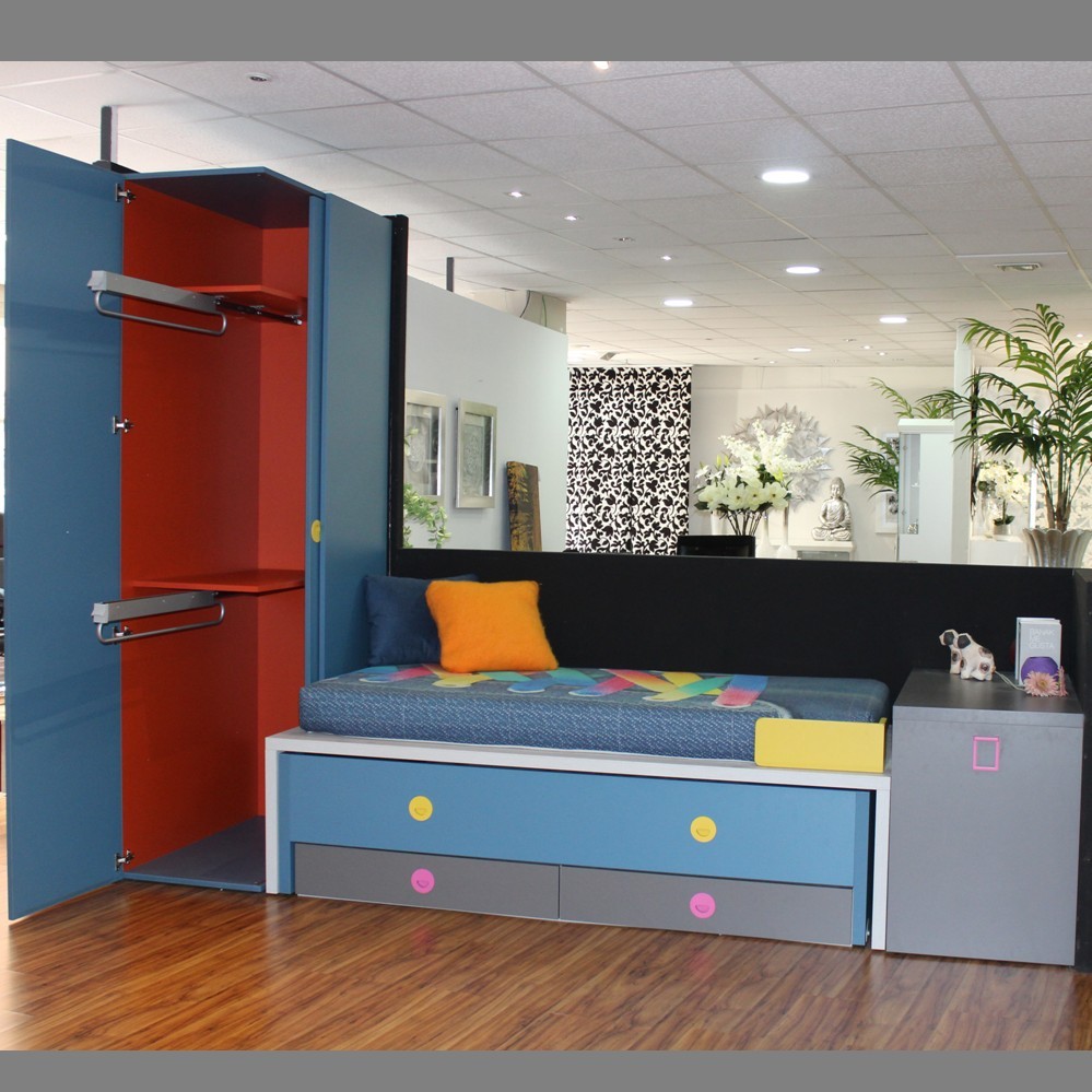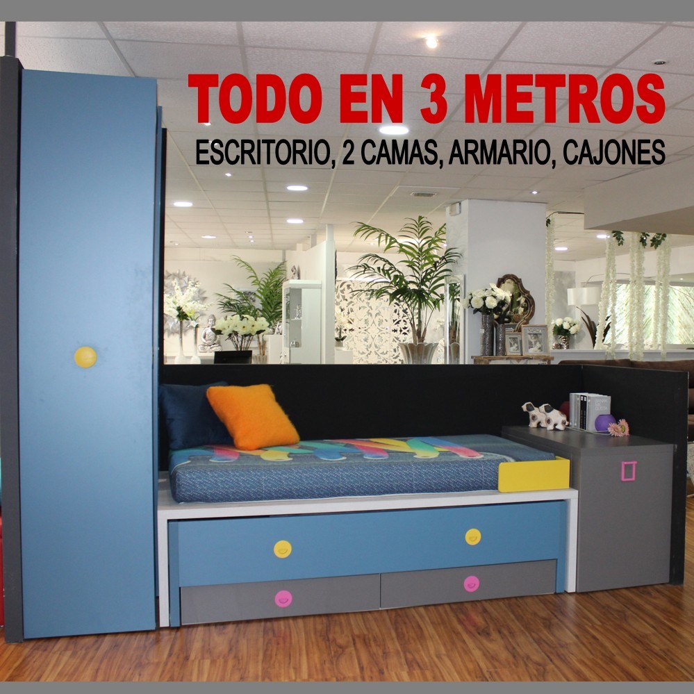 Mira esta idea, escritorio de 2 metros, armario para 2 metros de ropa colgada, 2 camas, 2 cajones y arcón en solo 3 metros por 1 metro de fondo.