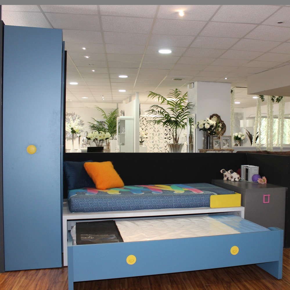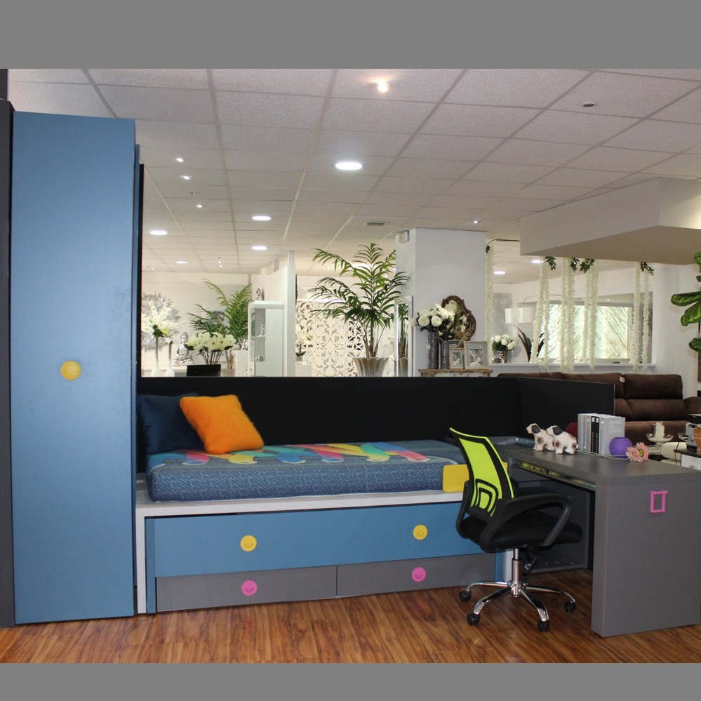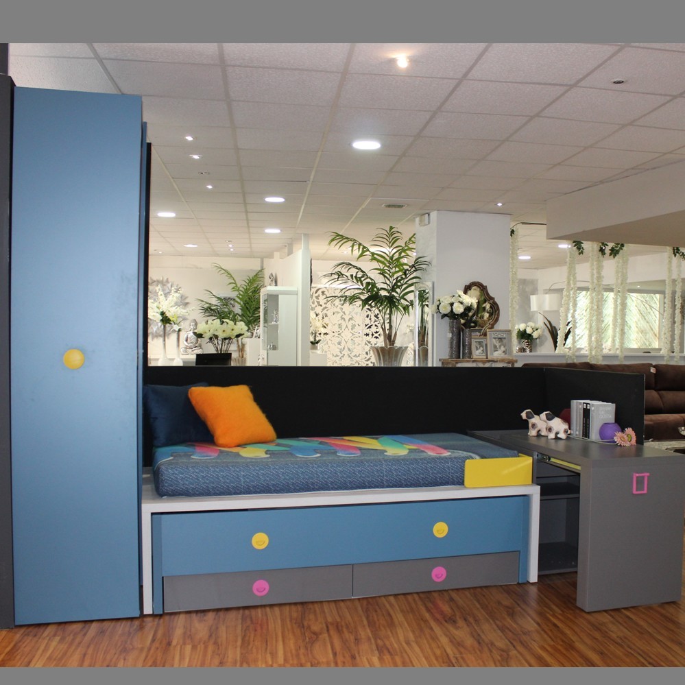 La cama superior lleva tablero de 4 cms y refuerzo metálico convirtiéndola en la más fuerte del mercado. Aunque se use como “sofá” sentándose en su borde varias personas no comba ni tiembla. La cama inferior también de gran calidad, abre con suma facilidad. Y para terminar, los dos cajones inferiores, que se abren con guías de aluminio, también están reforzados y son los más fuertes del mercado. Comprueba en el video como la chica despues de abrir el cajon se mete dentro para demostrar como aguanta perfectamente su peso sin deformarse ni romperse.