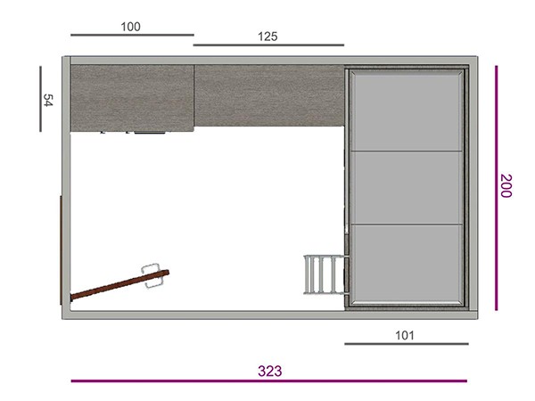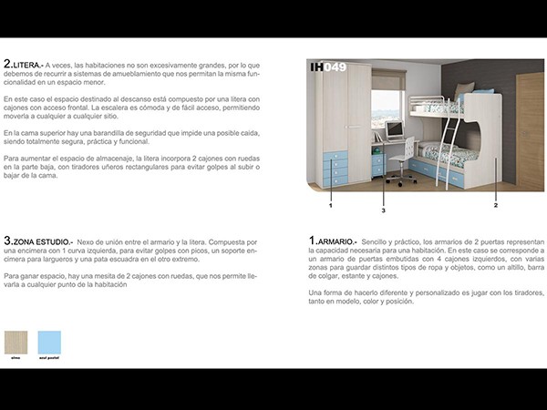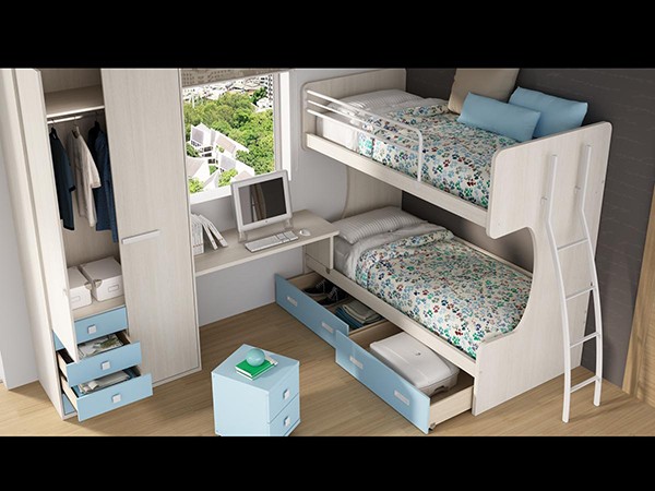 Habitación de solo 6 metros cuadrados, una pared de 3 y otra de solo 2 metros. ¿Cómo poner dentro armario, escritorio, mesita y 2 camas?, aquí tienes la solución. Las camas en tipo litera, de calidad y muy fuerte, con escalera frontal móvil, barandilla y 2 cajones contenedores para aprovechar el espacio. La zona de estudio la colocamos debajo de la ventana para recibir la luz natural y queda perfectamente integrada entre cama y armario.