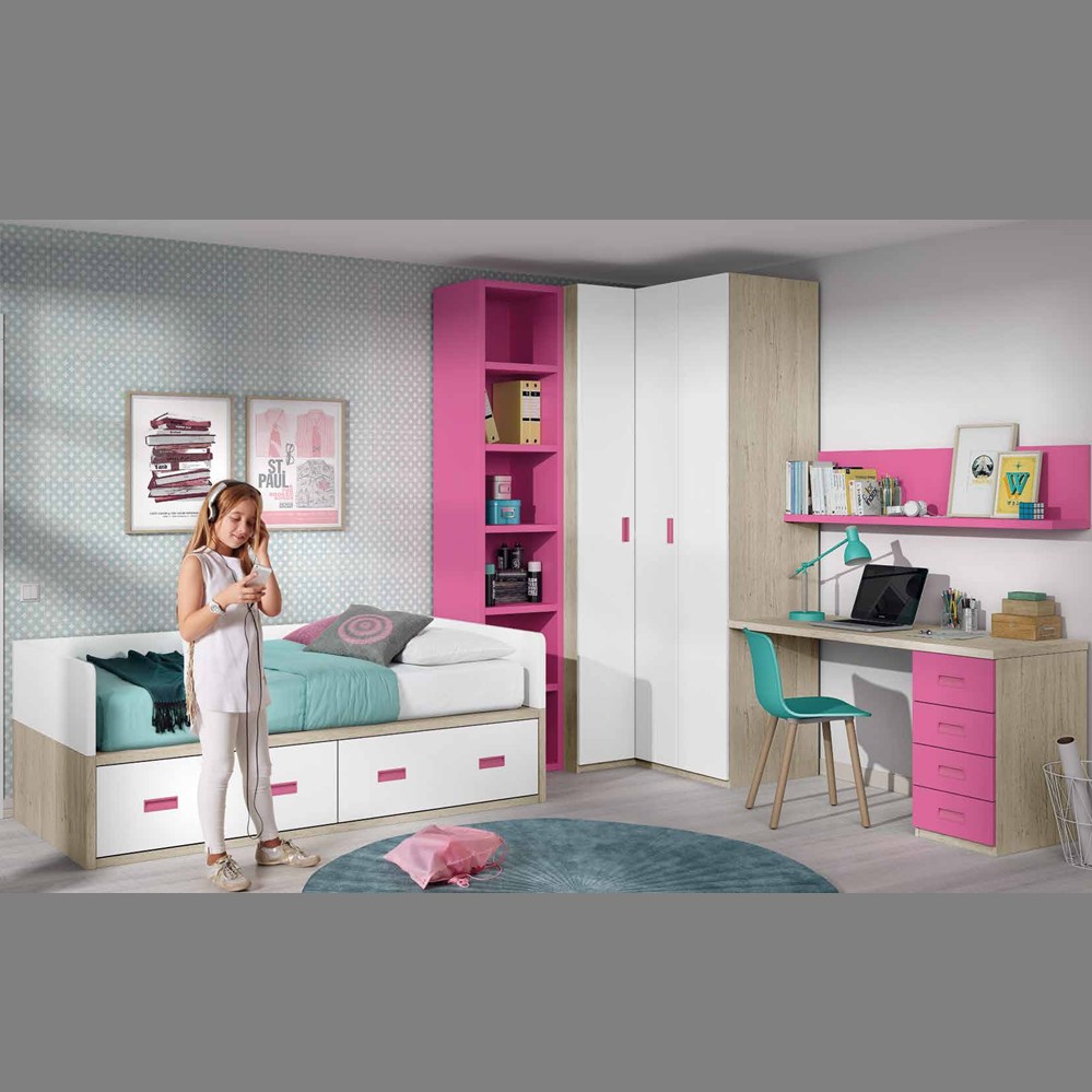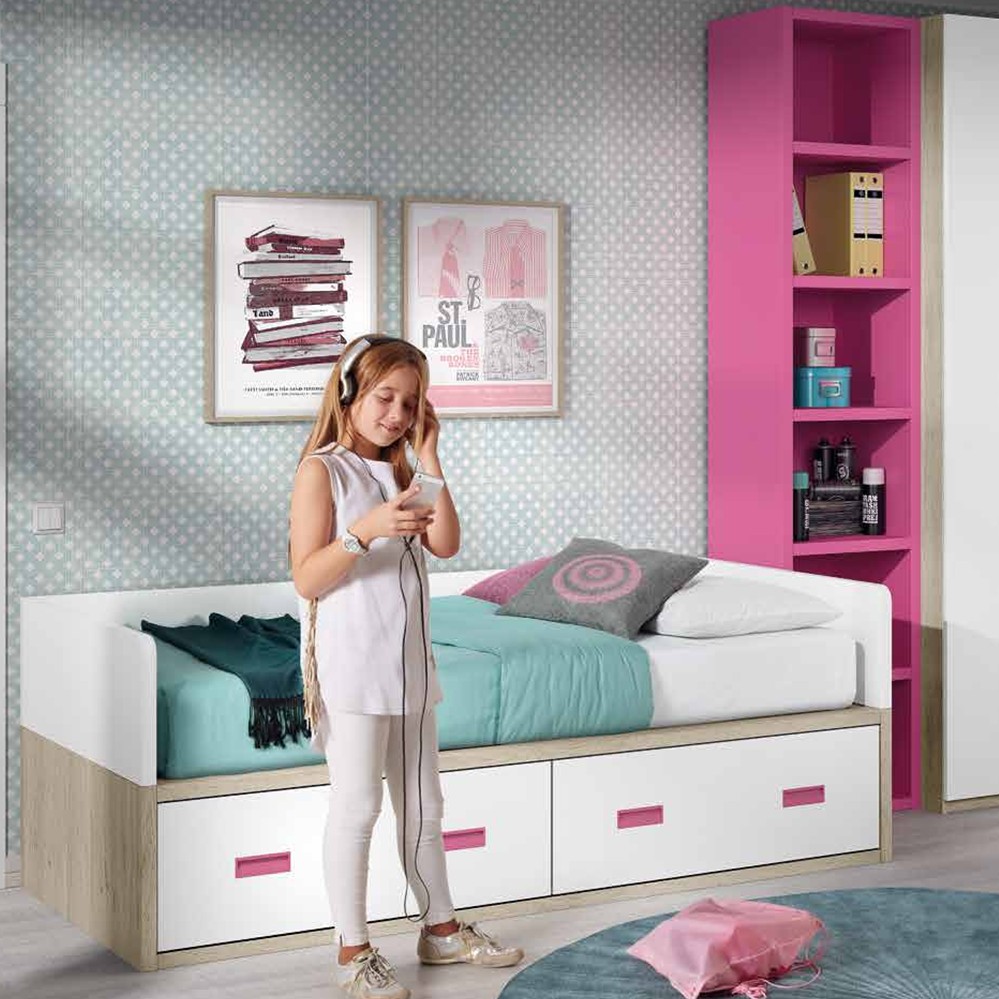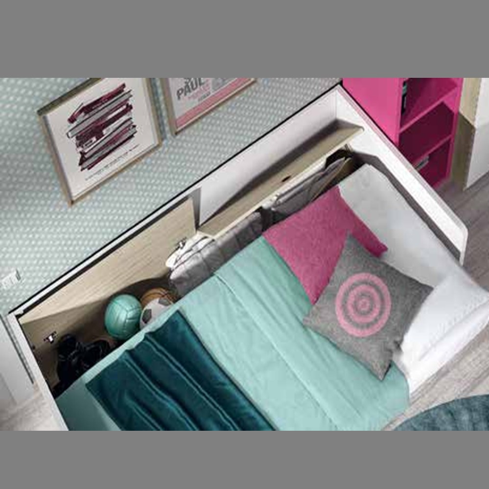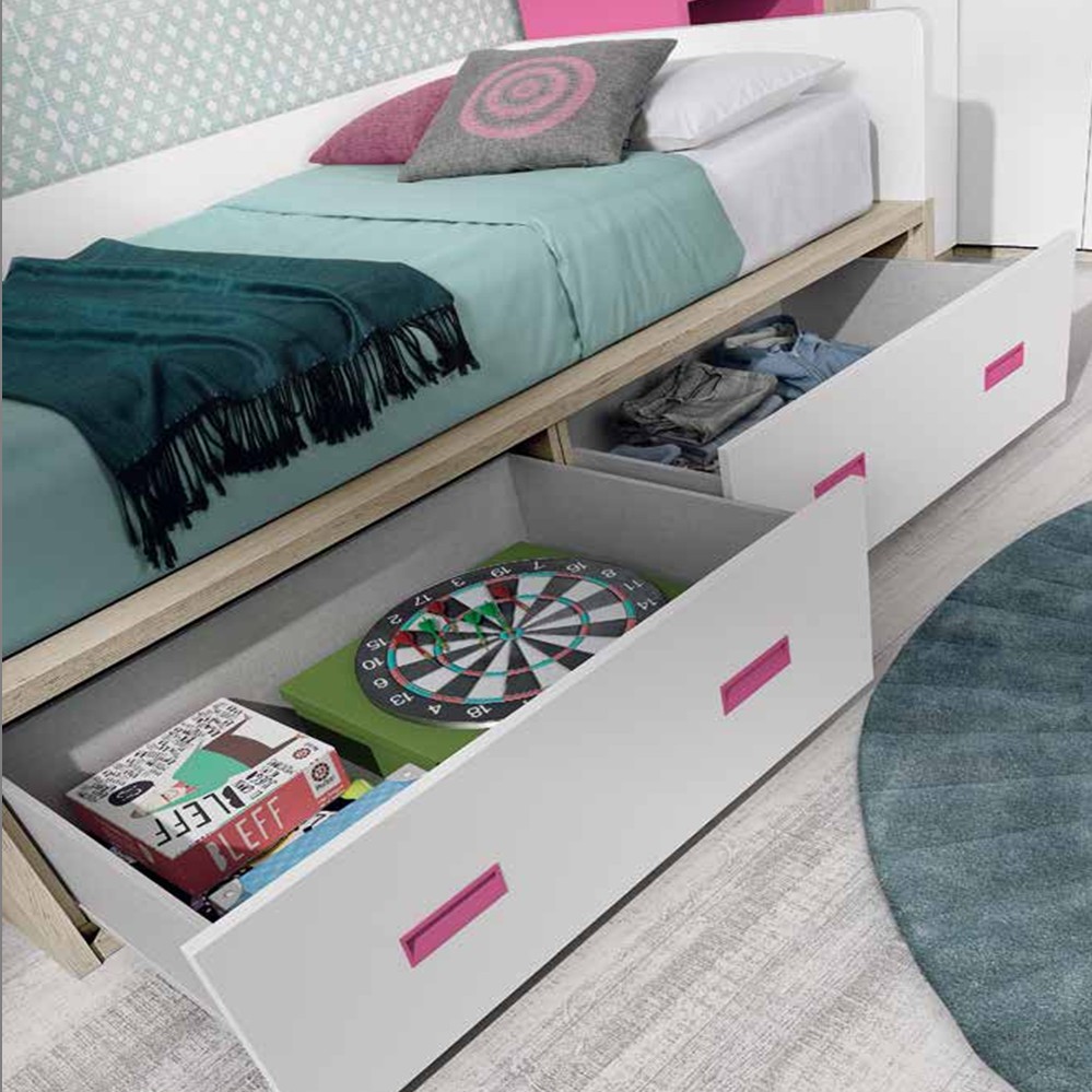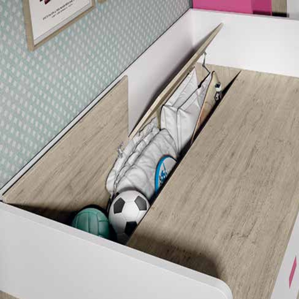 Esta cama aprovecha toda su parte baja de la forma más práctica. Por su parte delantera tiene 2 grandes cajones contenedores de gran capacidad con guías de aluminio que permiten un uso diario cómodo y fácil a la vez que un perfecto cierre y no tiene un fondo excesivo que permite almacenar con más orden. Y por la parte de atrás 2 puertas abatibles dan acceso a un compartimento de tamaño más largo para guardar cosas de mas volumen, como pueden ser cojines almohadas o incluso objetos como juguetes o pelotas. O bien puede usarse para artículos de uso menos cotidiano tales como mantas o edredones de temporada.