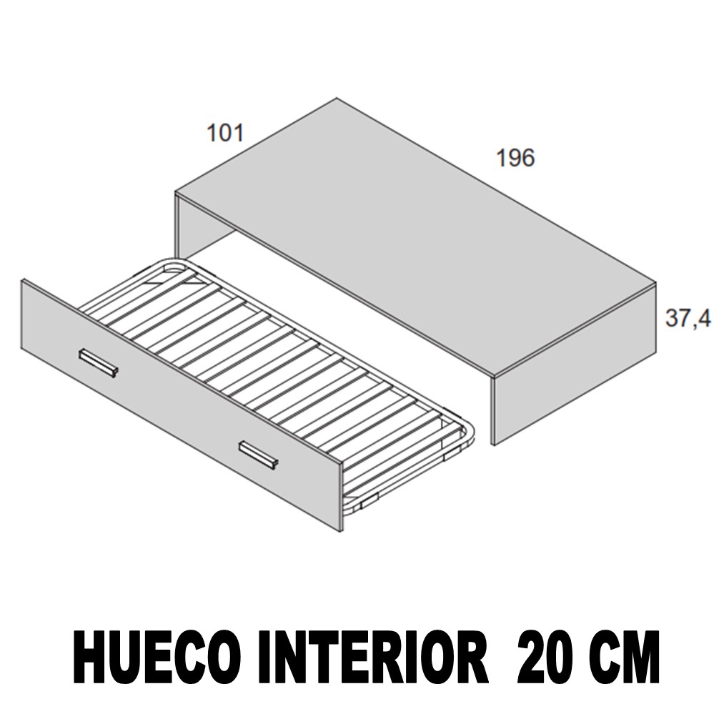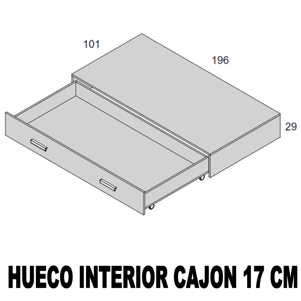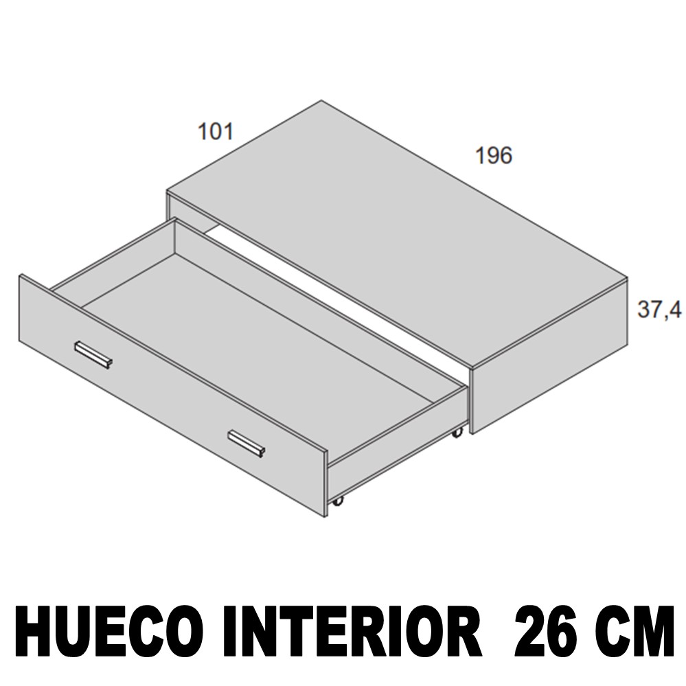 Una cama solida y estética que podríamos incluso con solo añadir unos cojines convertirla en un moderno sofá. En su parte inferior tenemos un hueco útil al que podemos aplicar 3 piezas diferentes según nuestras necesidades; opción somier lamas para colchón y hueco de 20 cm, opción supercajón que podemos usar para colchón o para almacenaje con un hueco libre de 17 cm o la opción de supercajón con altura especial y hueco útil de 26 con lo que le cabe cualquier buen colchón o también podemos usarlo como hueco almacenaje de gran capacidad y muy fácil acceso.