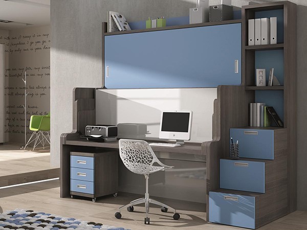 Tú decides, puedes montar tu habitación como un despacho, como un estudio o como una habitación multifuncional tipo loft añadiendo los complementos que necesites. O simplemente quieres un dormitorio juvenil con un amplio escritorio pero necesitas ganar espacio libre para zona de ocio o juego.