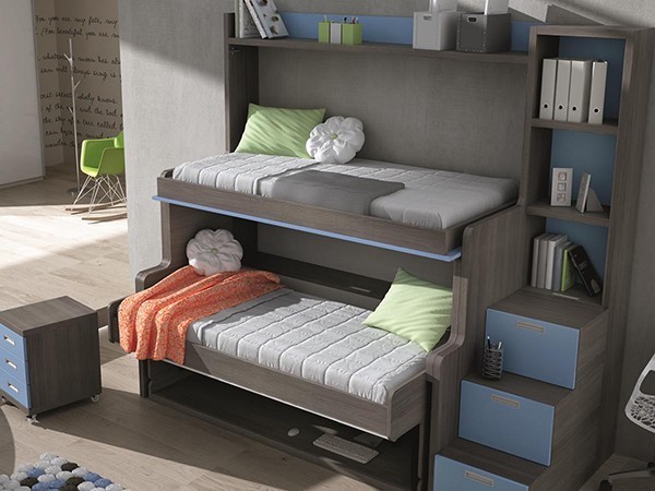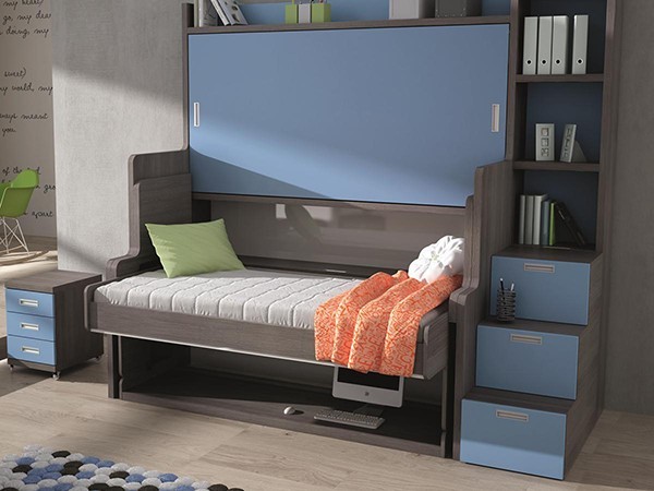 ¿Cama o escritorio? ¿Y porque no ambas cosas?, te imaginas montar tu despacho o estudio con una mesa de 2 metros y que con un simple giro la conviertas en una o en dos camas, una forma de reunir en una sola habitación todas las funciones que necesitas. Puedes abrir independientemente cada cama de forma que puedes tener; un escritorio, un escritorio mas una cama, o 2 camas sin escritorio. Esta es la mejor forma de optimizar el espacio. Puedes elegir entre 44 colores diferentes, colores más serios si quieres hacerte un estudio o despacho, o colores más alegres si lo que quieres es montarlo con un ambiente desenfadado y luminoso.