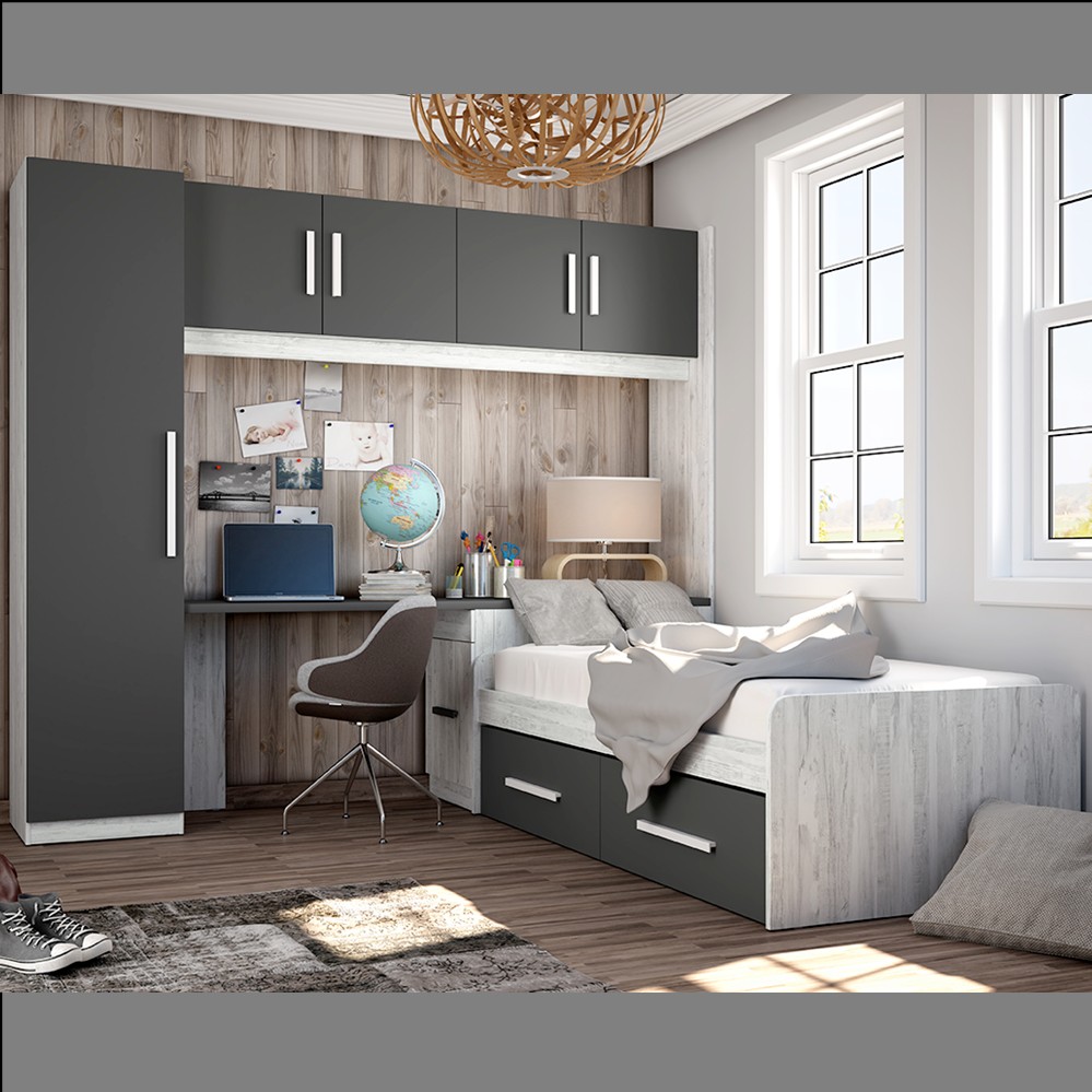 Existen todo tipo de muebles a juego para completar el amueblamiento de tu habitación; armarios de distintas medidas, mesitas de noche mesas estudio, estantes, literas, puentes…