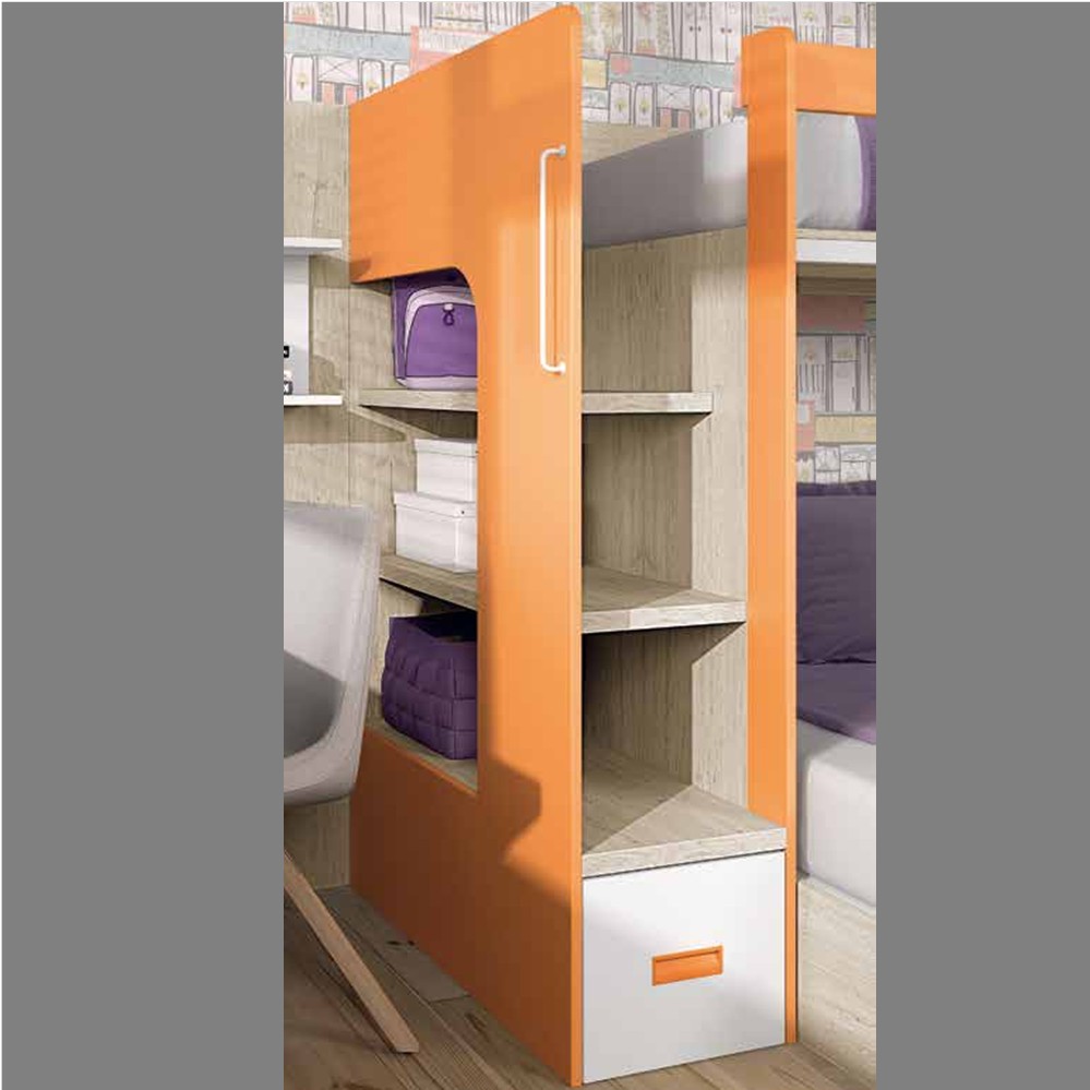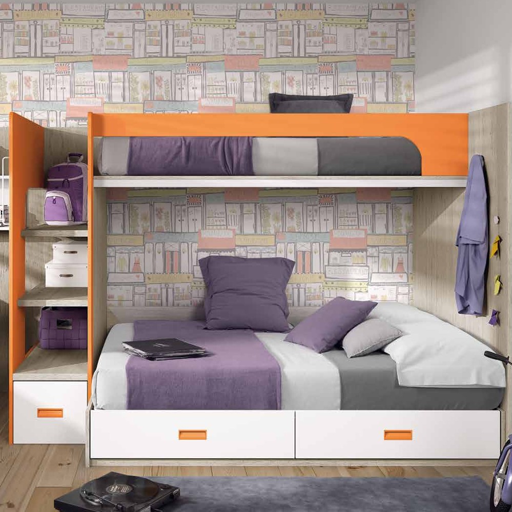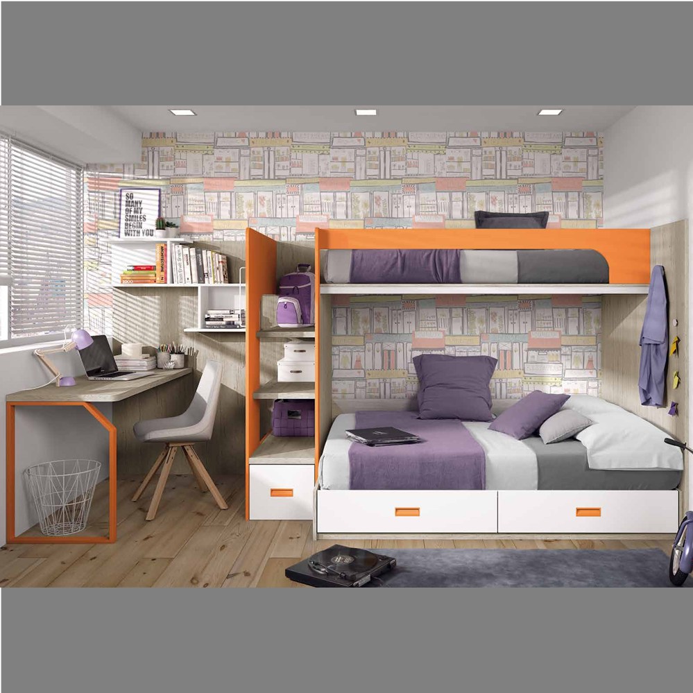 Hay ocasiones en que bien por necesidad o bien porque los niños ya no son “tan niños” necesitamos poner una cama de 135 en nuestro dormitorio juvenil. Aquí te proponemos una solución en la que combinamos una cama de 135 que además incorpora un arcón con 2 cajones frontales + hueco para aprovechar toda su parte inferior para almacenamiento, mas una cama de 90, completando la composición una práctica estantería de un meto de fondo con estantes muy fuertes de de 35 mm que usamos además como escalera.