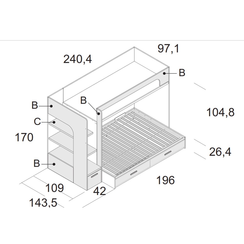 Toda la estructura de la litera acabada en tableros de gran solidez, para no tener ningún problema de fortaleza. Todo en tan solo 241 cm.