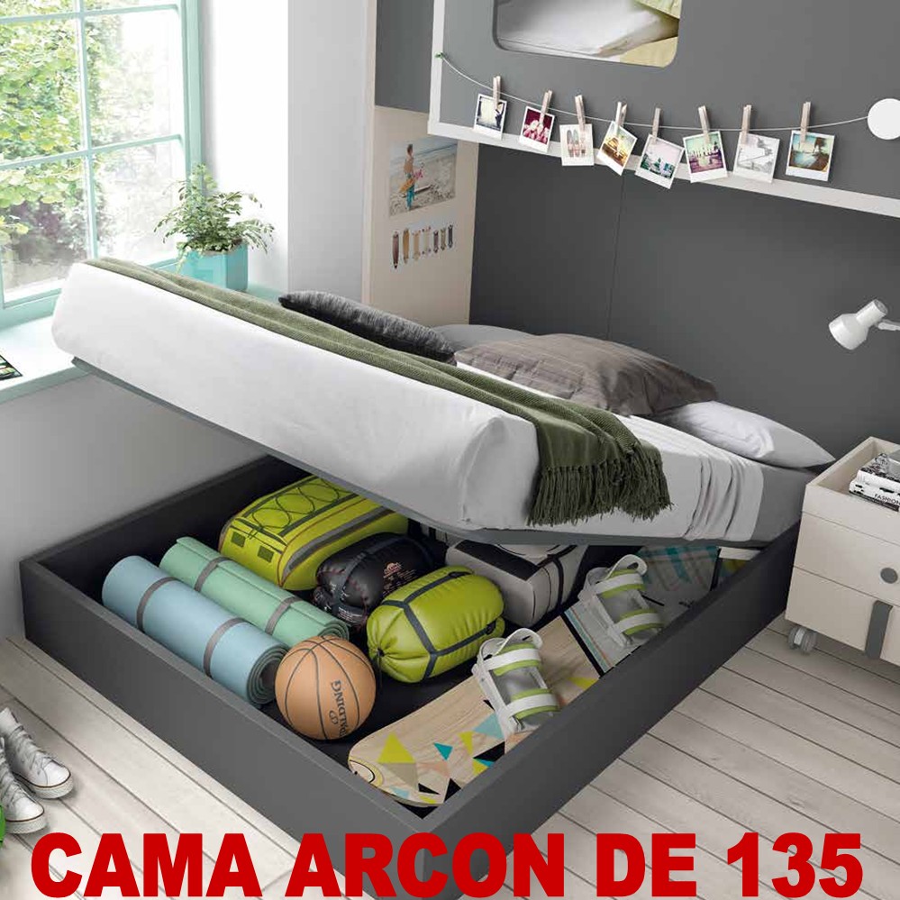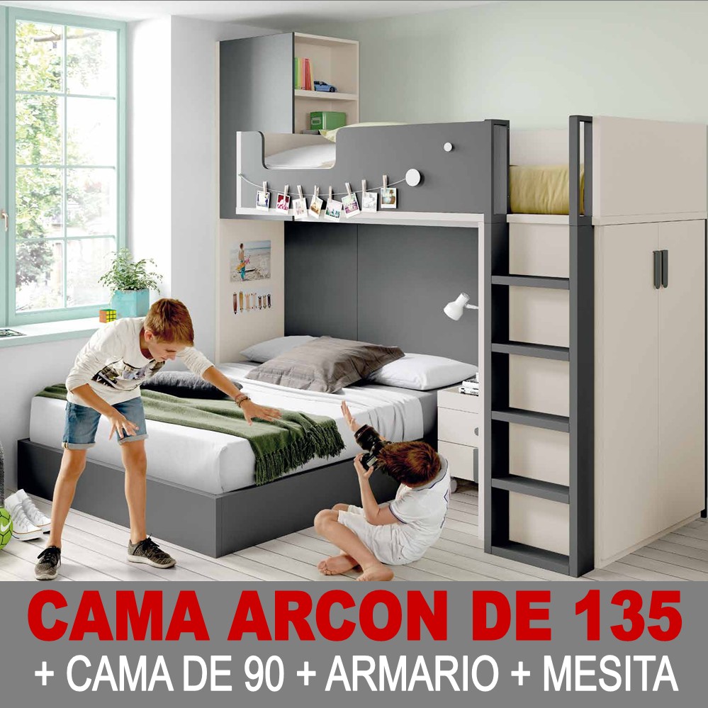 Aquí tienes la solución CAMA DE135 CON ARCON + CAMA DE 90 + ARMARIO + MESITA + ESTANTERIA en poco más de 2 metros