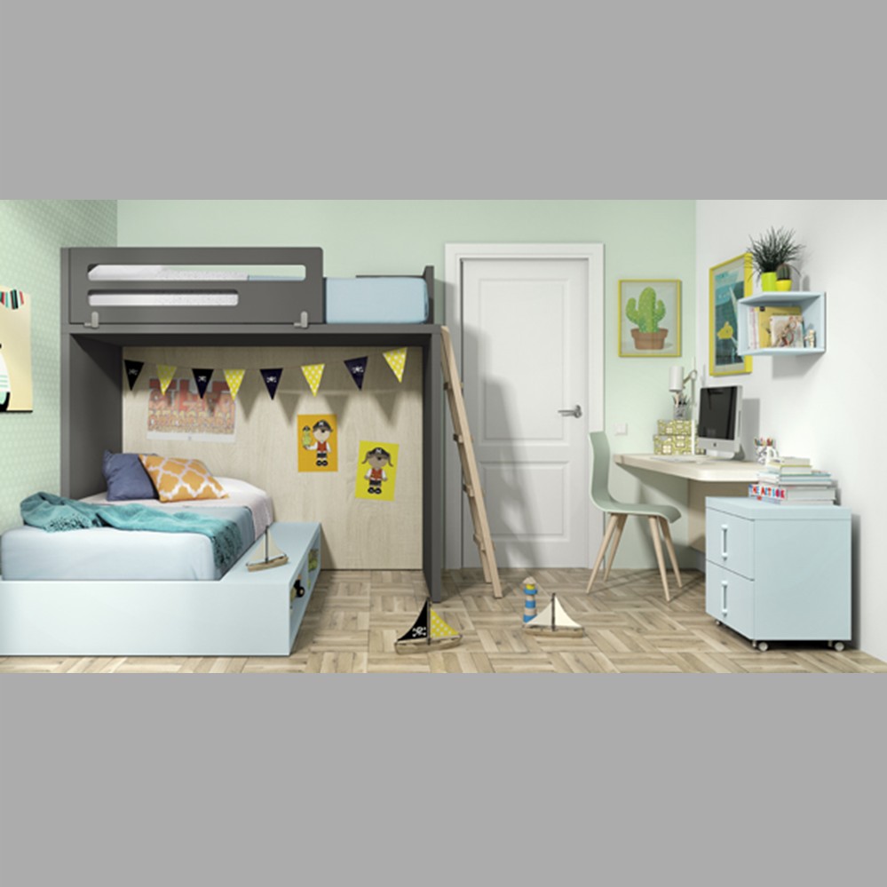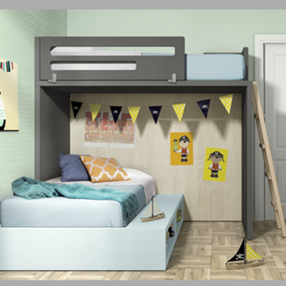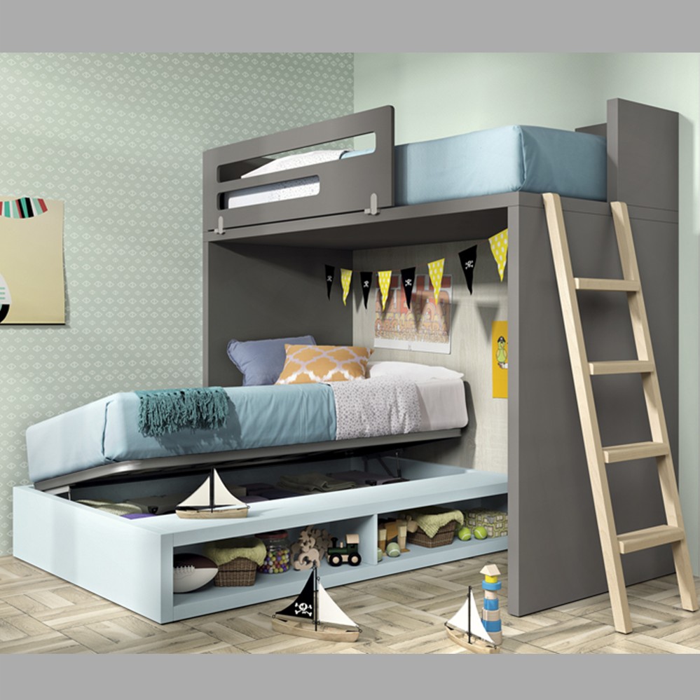 Hay ocasiones en que bien por necesidad o bien porque los niños ya no son “tan niños” necesitamos poner una cama de 135 en nuestro dormitorio juvenil. Aquí te proponemos una solución en la que combinamos una CAMA ARCON TATAMI que puede ser de 90, 105 o 135 para que almacenes por dentro y por fuera. En sus huecos diáfanos puedes colocar los objetos de uso diario con acceso rápido además de servirte de mesita o de improvisado asiento y aprovechamos toda la parte inferior del colchón para almacenamiento con su sistema de apertura, mas una cama superior de 90.
