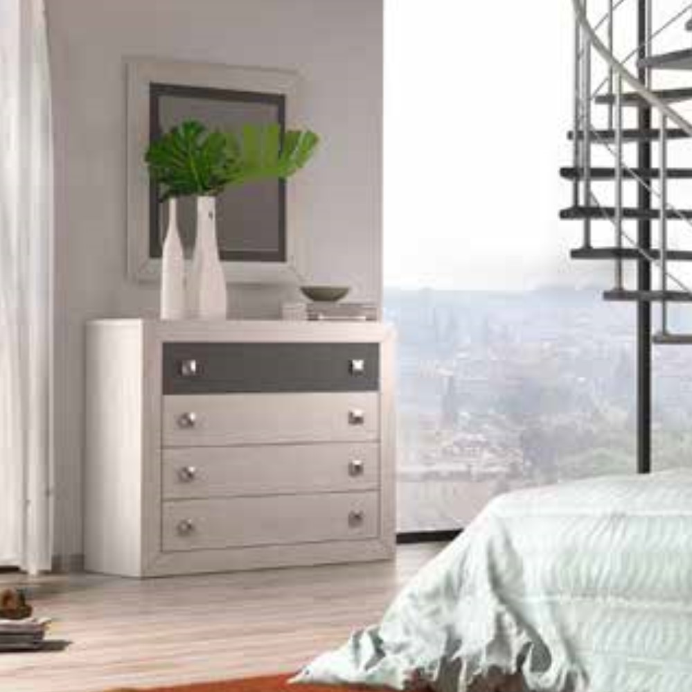 Dormitorio de líneas modernas, 3 cabeceros distintos a elegir con comoda, sinfonier, espejo de colgar, espejo de pie y armario a juego. En colores roble tibet, cambrian y pizarra.
