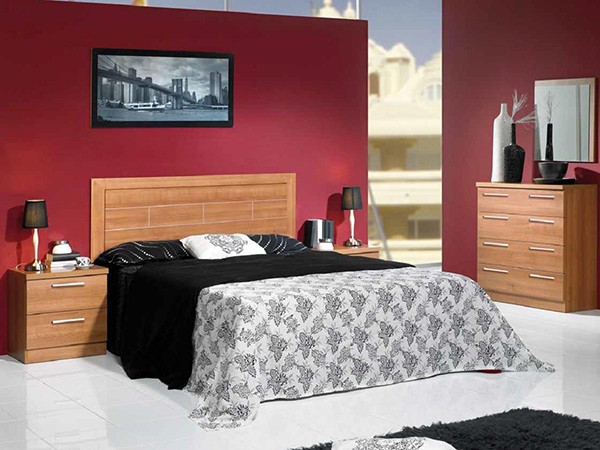 Dormitorio de línea moderna, compuesto de cabecero, 2 mesitas, cómoda y espejo.