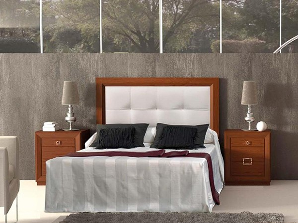 Dormitorio matrimonio de línea moderna, compuesto por cabecero madera tapizado y 2 mesitas, máxima calidad, acabado en madera, 14 colores a elegir, 6 de barniz además plata, oro, blanco o ceniza. Existen cómoda, sinfonier y armarios a juego.