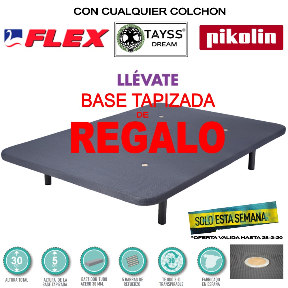 Elige tu colchón, FLEX, PIKOLIN o TAYSS de nuestra exposición y llévate a juego la base tapizada de regalo.