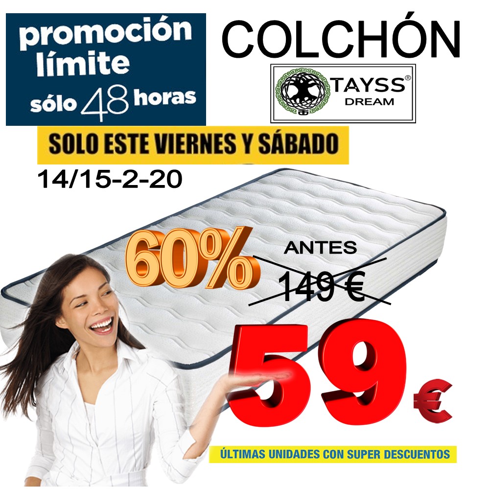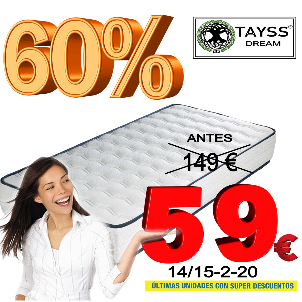 ULTIMAS UNIDADES, aprovecha esta oportunidad apta solo para los más rápidos, colchones de calidad en medida de 90x190x22 con un 60% de descuento, por solo 59€. Además, este fin de semana todos los demás modelos de colchones de 90 de todas las calidades con descuentos.