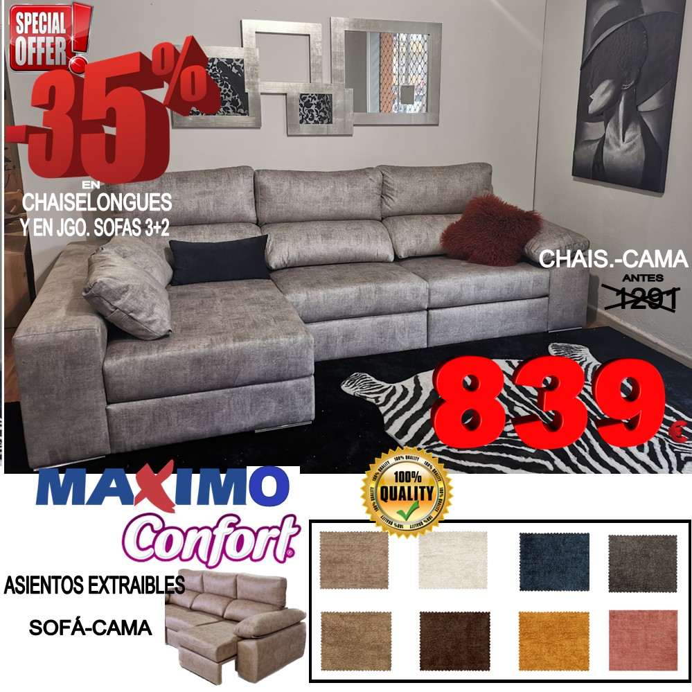Sofás cómodos, desenfundables, de calidad, con buenos acabados y buenas tapicerías con tratamientos EASY CLEAN, de FACIL LIMPIEZA, ahora con 35% de descuento en una variada selección de modelos en chaislongues o en jgo. de 3+2, con muchas posibilidades de medidas y en más de 50 colores diferentes a elegir para que lo personalizes a tu gusto. Este modelo además es fácilmente transformable en cama. Porque los asientos son totalmente extraíbles con apoyo a suelo, por lo que son especialmente fuertes y fiables y consigues fácilmente una buena cama.
