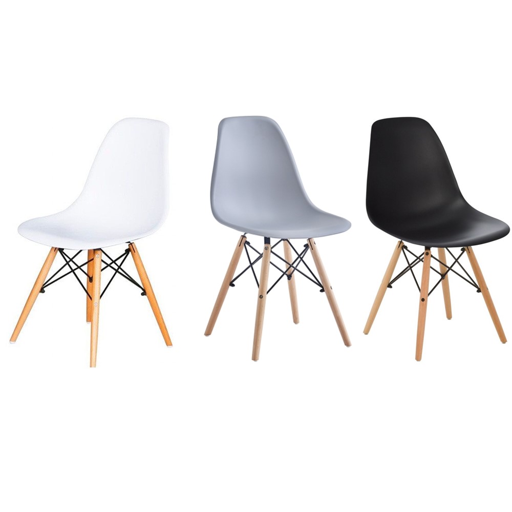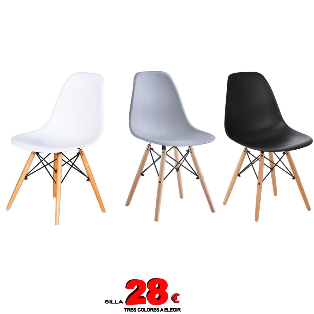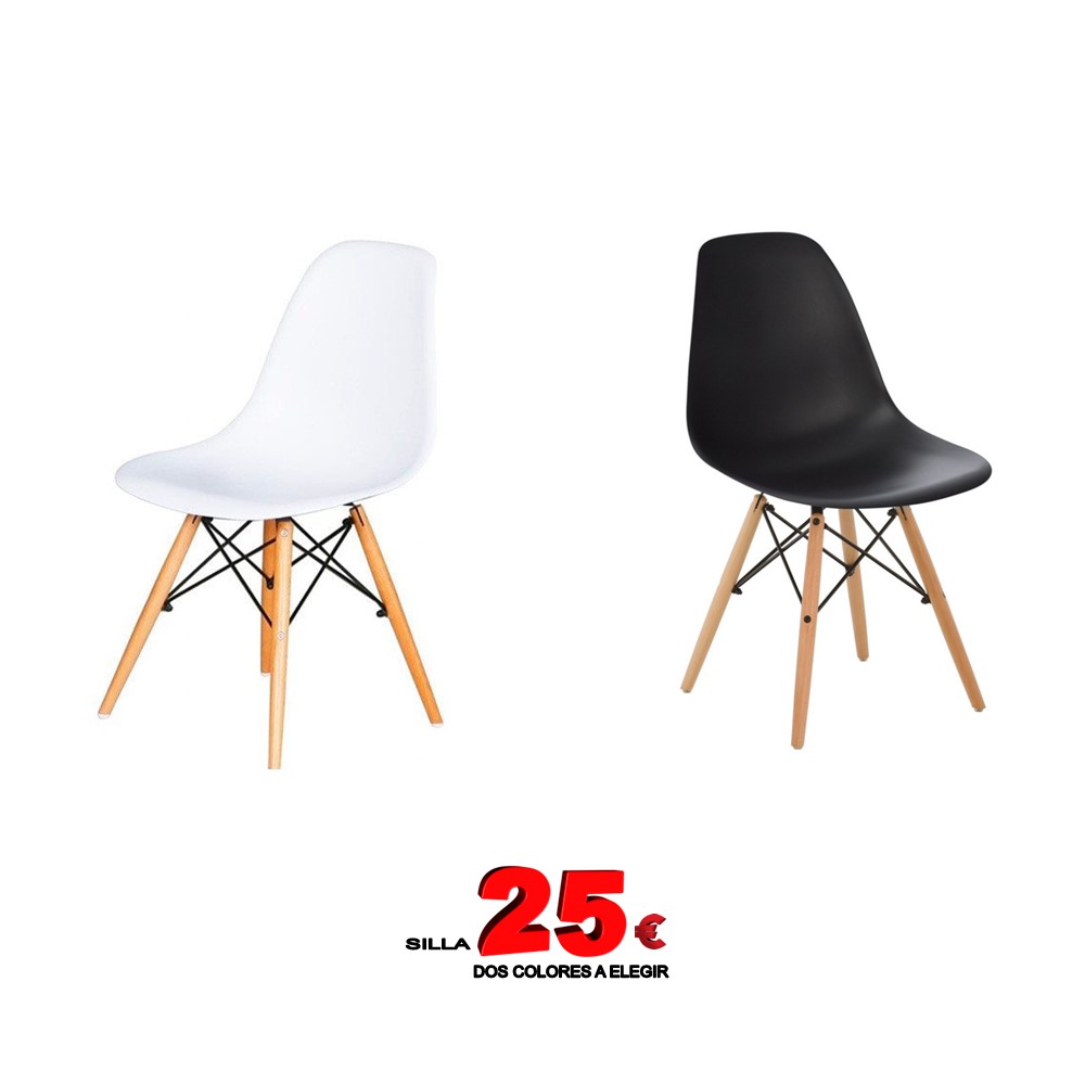 Sillas a 25€ unidad, patas en madera, asiento y respaldo en resina sintética, colores a elegir, blanca o negra. Medidas 84x45x45.