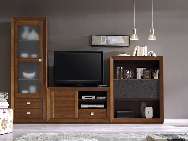Modular de línea moderna, acabado en madera color cerezo o blanco nieve, combinable con puertas en piedra o grafito. Existen más composiciones de distintas medidas y más piezas para combinar, además de aparador y vitrina, así como mesas de centro y comedor a juego.