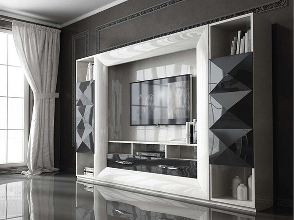 Modular de línea moderna, acabado en laca de la máxima calidad, 72 colores a elegir, alto brillo, mate o una combinación de ambos. Existen más composiciones de distintas medidas y más piezas para combinar, además de aparador y vitrina, así como mesas de centro y comedor.
