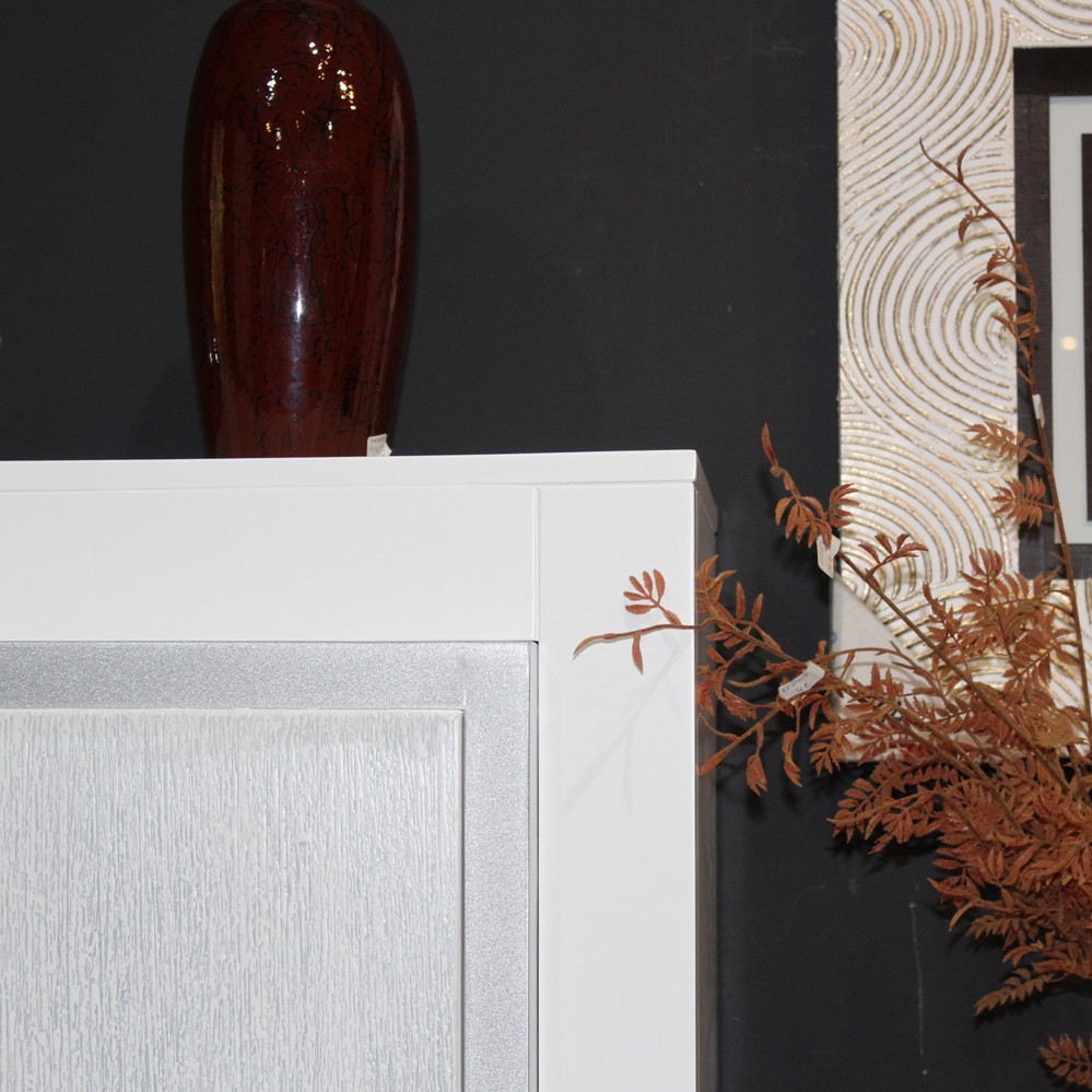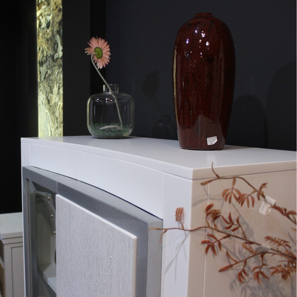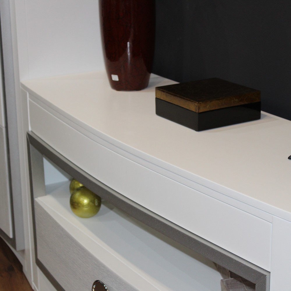 Líneas modernas en lacas de alta calidad. Formas rectas combinadas con frentes curvos alternando formas cóncavas y convexas que le aportan esa suavidad de líneas en forma de hondas y combinados con chapas naturales que le aportan un aire cálido y distinguido.