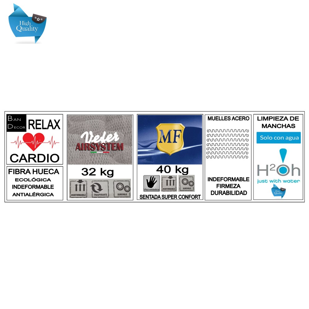 Fijo disfrutaras de su sentada SUPER CONFORT, una sentada con una comodidad superior con su VISCO VEFER DE 40 KG, con su sistema AIRSYSTEM, indeformable y transpirable. Sus almohadones de su respaldo ergonómico darán una acogida increíble por su FIBRA HUECA ecológica, indeformable y antialérgica. Y su suspensión en muelle de acero indeformable tipo NOSSAG sumaran un extra de adaptabilidad.