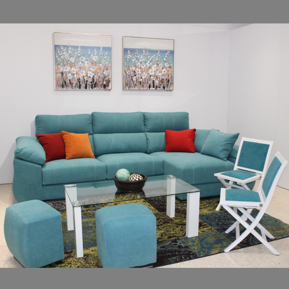 Aquí la tienes, con 2 sillas plegables de calidad en un brazo y dos poufs en el otro