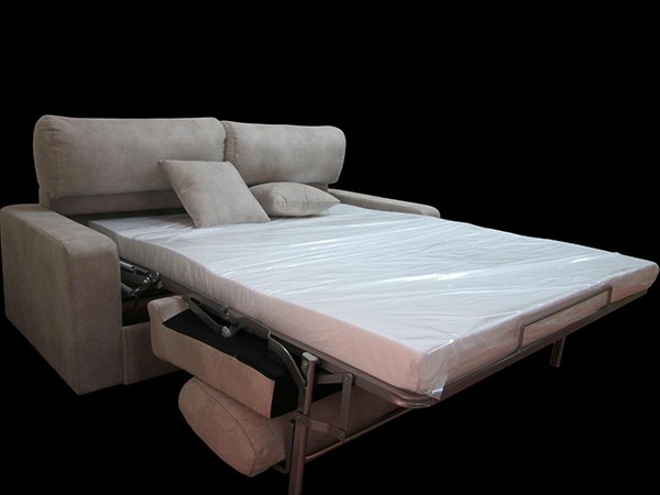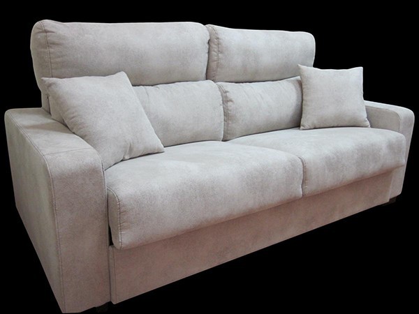 Sofá 3 plazas de calidad, cómodo como sofá y como cama, con fácil mecanismo de apertura. No hay que quitar ningún cojín para abrirlo. Cabezales reclinables para un perfecto apoyo cervical. Estructura de acero de alta resistencia. Cojines de asiento y respaldo desenfundables, colores a elegir. Opcionalmente se puede pedir con mecanismo de desplazamiento para poder mover o retirar de la pared fácilmente y existen chaislongue a juego para convertirlo en un chaislongue cama. También dispone de sillones o sofás fijos sin cama para poder hacer juegos de 3+2 plazas o tresillos. Cuando no son camas los sofás de 3 o 2 plazas incorporan arcón abatible. Posibilidad de mecanismo de desplazamiento para su fácil manejo para cambiarlo de posición, retirar de la pared o girarlo.